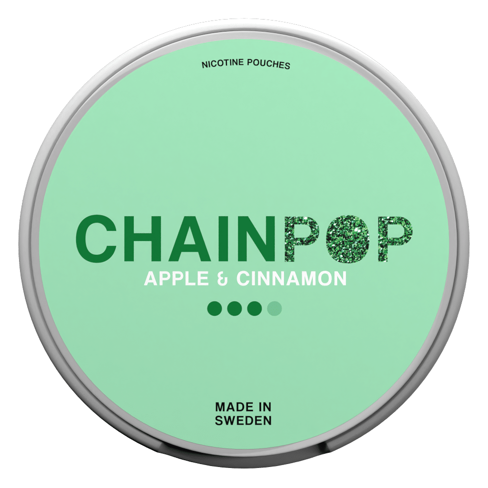 Chainpop Apple & Cinnamon – Bite into the stingy green apple, that seduces you with a blend of sweet and sour magic. Topped with a sting of warm cinnamon for the cold winter days, for energy, enjoyment and that unique sparkling Chainpop experience. This nicotine snus comes in slim pouches for a perfect fit and with a nicotine strenght of 9 mg per pouch.