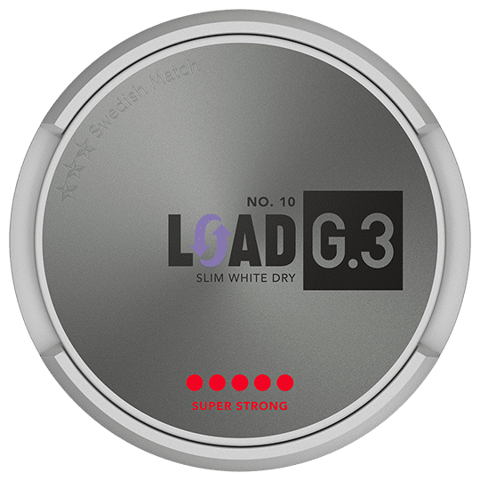 G.3 LOAD Slim White Dry Super Strong – Contains 30% more nicotine than G.3 Extra Strong. Combined with the format Slim White Dry – 20% less drip than G.3 pouches in the Slim White format – it results in a SUPER STRONG product.