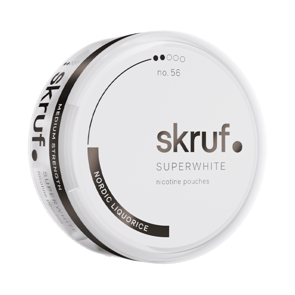 Skruf Super White no 56 Nordic Liquorice Medium Strenght – With a clear taste of nordic licorice and a hint of mint this pouch tastes like heaven under your lip. Normal nicotine level of 8 milligram per gram.Â